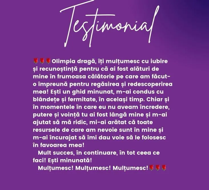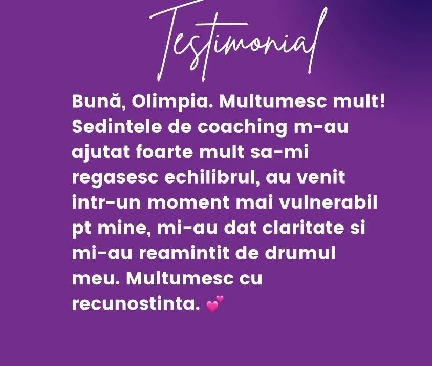 Susțin femeile să își conștientizeze potențialul interior și să depășească fricile, blocajele emoționale și convingerile care le limitează, pentru a regăsi echilibrul, claritatea și împlinirea.